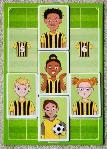 Aim: Be the first person to build your team in the correct formation then find your goal card to score the winning goal!
